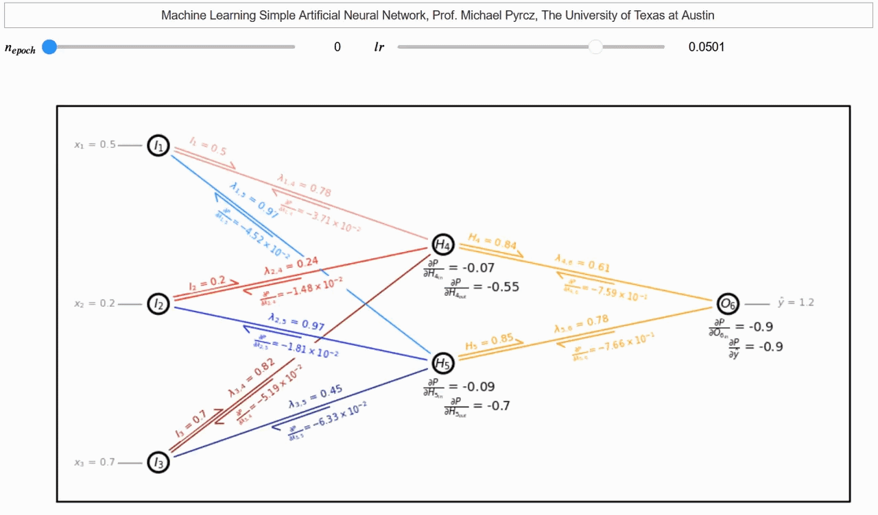 Para cada capa de la red neuronal, calculamos el gradiente de la función de pérdida con respecto a los pesos y sesgos de la capa utilizando la regla de la cadena y el gradiente de la capa anterior. Luego, actualizamos los pesos y sesgos de la capa. Este proceso se repite para todas las capas de la red neuronal. Un hermoso gif creado por Michael Pyrcz muestra cómo funciona la retropropagación.